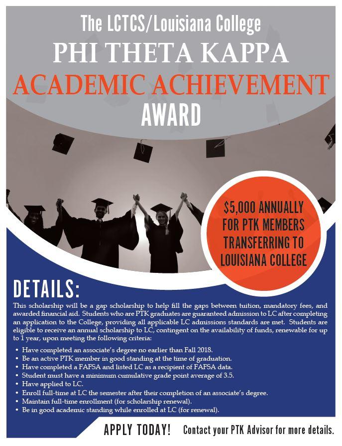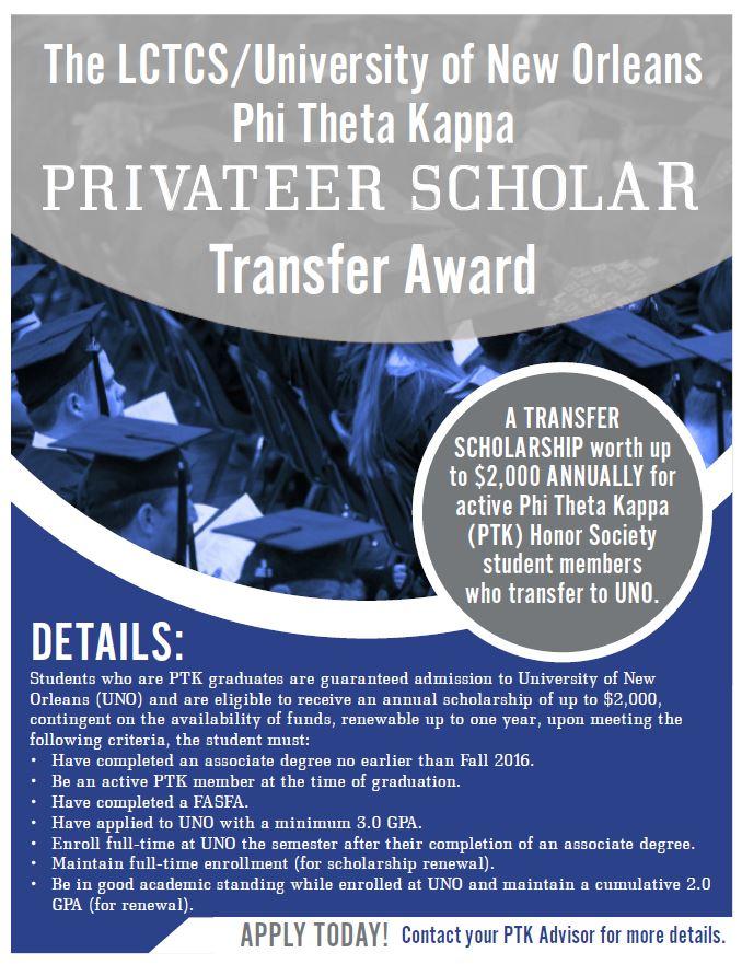 Membership in PTK comes with many benefits, though potential members are most often interested in transfer scholarship opportunities. PTK Transfer Scholarships are offered at Louisiana universities listed below: