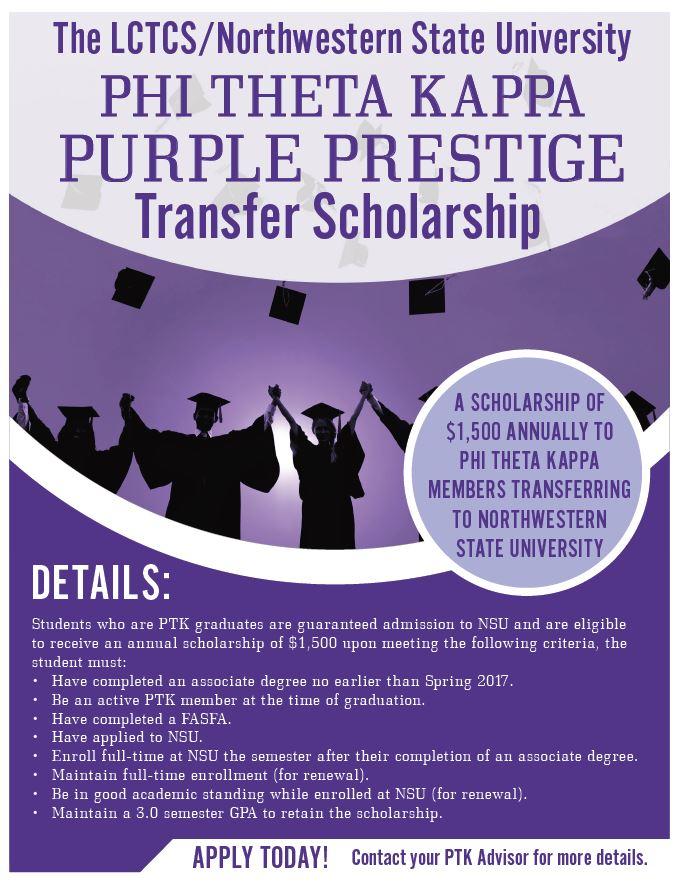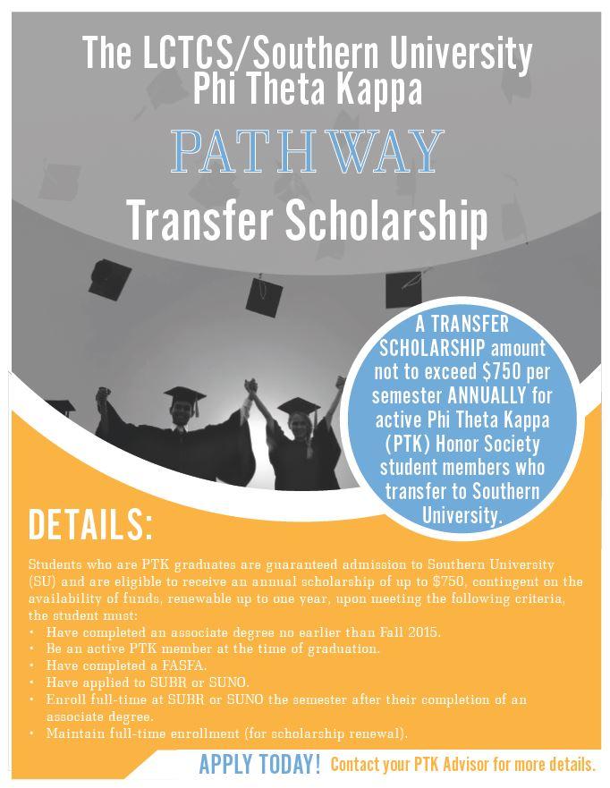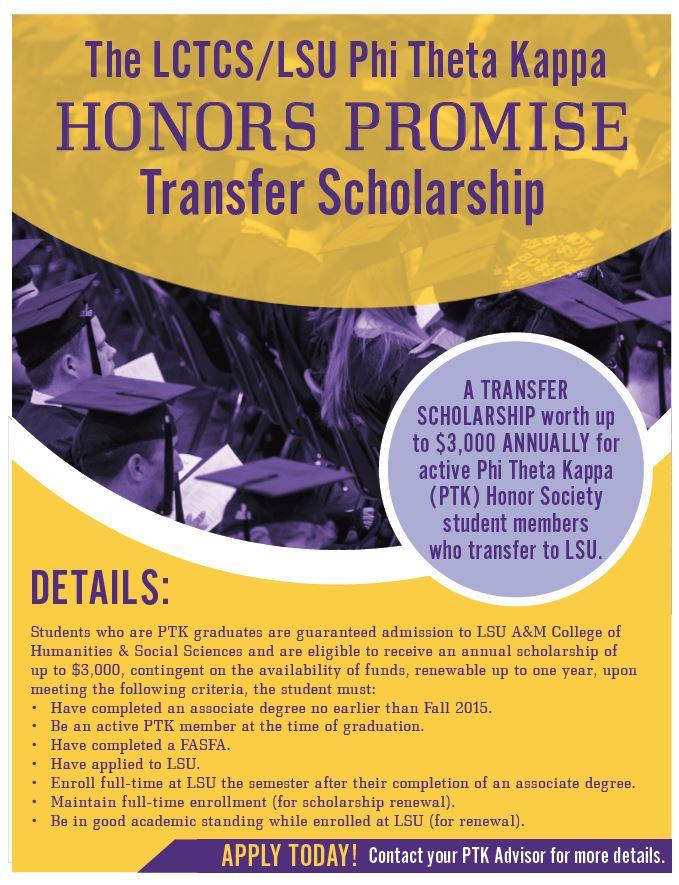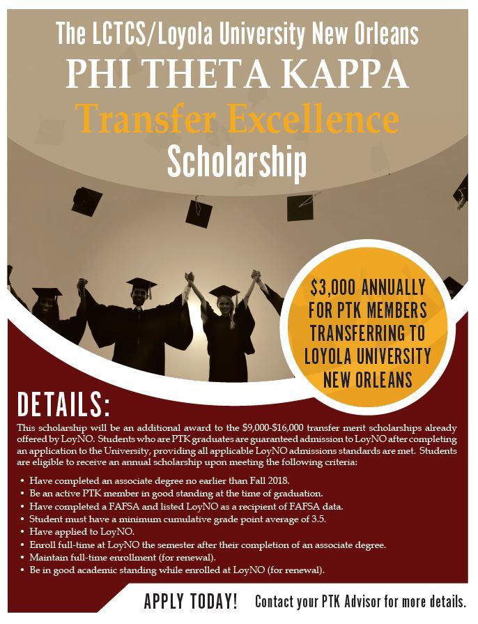 Membership in PTK comes with many benefits, though potential members are most often interested in transfer scholarship opportunities. PTK Transfer Scholarships are offered at Louisiana universities listed below: